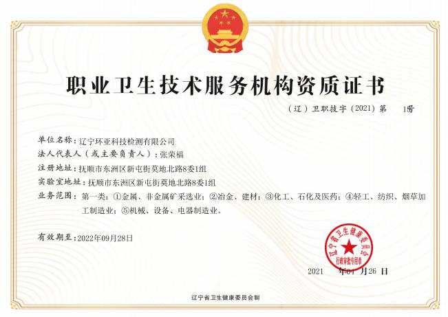 遼寧環(huán)亞科技檢測有限公司秉承“公平、公正、客觀、真實(shí)”的服務(wù)理念,力求為遼寧省各企事業(yè)等用人單位提供更優(yōu)質(zhì)的服務(wù),公司領(lǐng)導(dǎo)率領(lǐng)全體員工歷時(shí)一年零八個(gè)月的時(shí)間操練各項(xiàng)基本技能,于2016年8月9日取得了(遼)安職技字(2016)第B-0019號《職業(yè)衛(wèi)生技術(shù)服務(wù)機(jī)構(gòu)資質(zhì)證書》